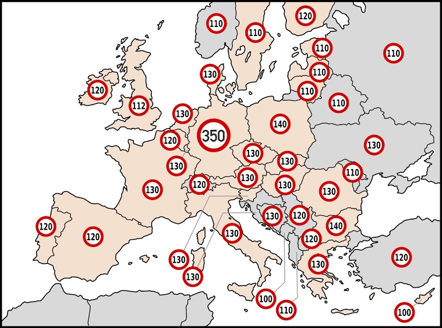 歐洲主要國家高速最高限速(德國數據不實) 圖片來源:Der Postillon