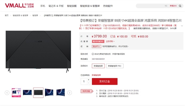 目前,榮耀智慧屏PRO版現貨銷售,榮耀智慧屏則正接受預約,100元訂金抵600元,11月1日現貨開搶。
