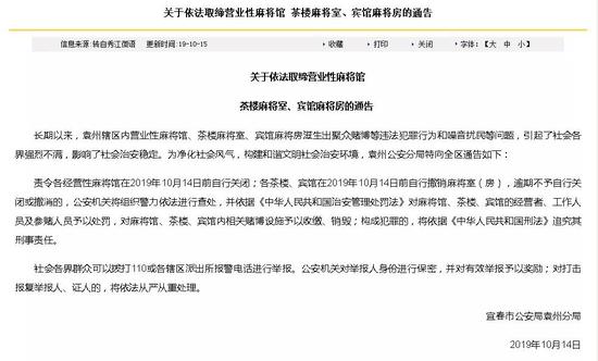 10月14日宜春袁州區、10月17日豐城市、10月18日上饒信州區、10月19日上饒萬年縣、10月20日上饒玉山縣……一週之內,江西多地公安部門發佈通告,要求經營性麻將館、棋牌室自行關門,否則依法查處。