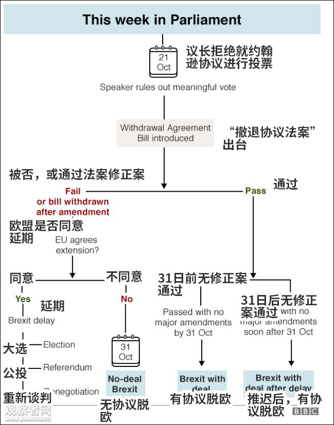 約翰遜自上台開始就一直強調,一定會帶領英國在10月31日準時“脱歐”。儘管一次次面臨議會的“重錘”,他還是沒有鬆動,還説“寧願死在溝裏也不延遲脱歐”。而從上述圖表展示的進程來看,如果約翰遜想要避免“死在溝裏”,程序上有兩種可能:一是上述立法在31日前完成,但考慮到時間緊迫,這種可能性很小;第二條路就是歐盟拒絕延期申請,這樣,英國就會“無協議脱歐”。