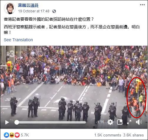 19日,香港特區立法會議員蔣麗芸在社交媒體上曬出一段西班牙警察驅散並逮捕示威者的視頻,她的關注點落在一旁拍攝的記者身上:他們在警察的身後或身旁拍攝,並沒有將鏡頭懟上警察的臉,妨礙執法。