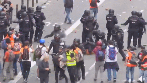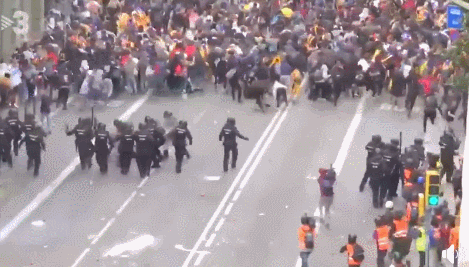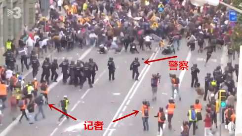 通過視頻可以看見,西班牙警察在前進過程中,記者們自動從一旁撤回到警察身後,防止擋路: