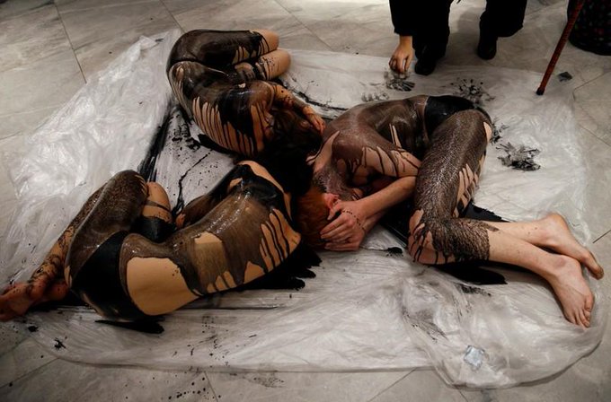 抗議石油公司,環保主義者躺在塑料上塗滿黑漆半裸抗議