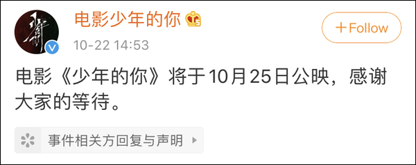 據觀察者網此前報道,今年6月24日,就在距離上映僅剩3天的情況下,《少年的你》還未在任何票務網站上開啓預售,引發不少猜測。隨後,該片官方微博宣佈撤檔,新的檔期擇時公佈。