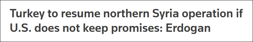 根據美國和土耳其18日達成的協議,土耳其方面同意暫停在敍利亞北部的軍事行動,“立即”停火120小時,截止日期為當地時間22日晚10點(北京時間23日凌晨3點)。如果庫爾德武裝“人民保護部隊”(YPG)完全離開邊境地區20英里(約合32公里),這一時間可能會延長。
