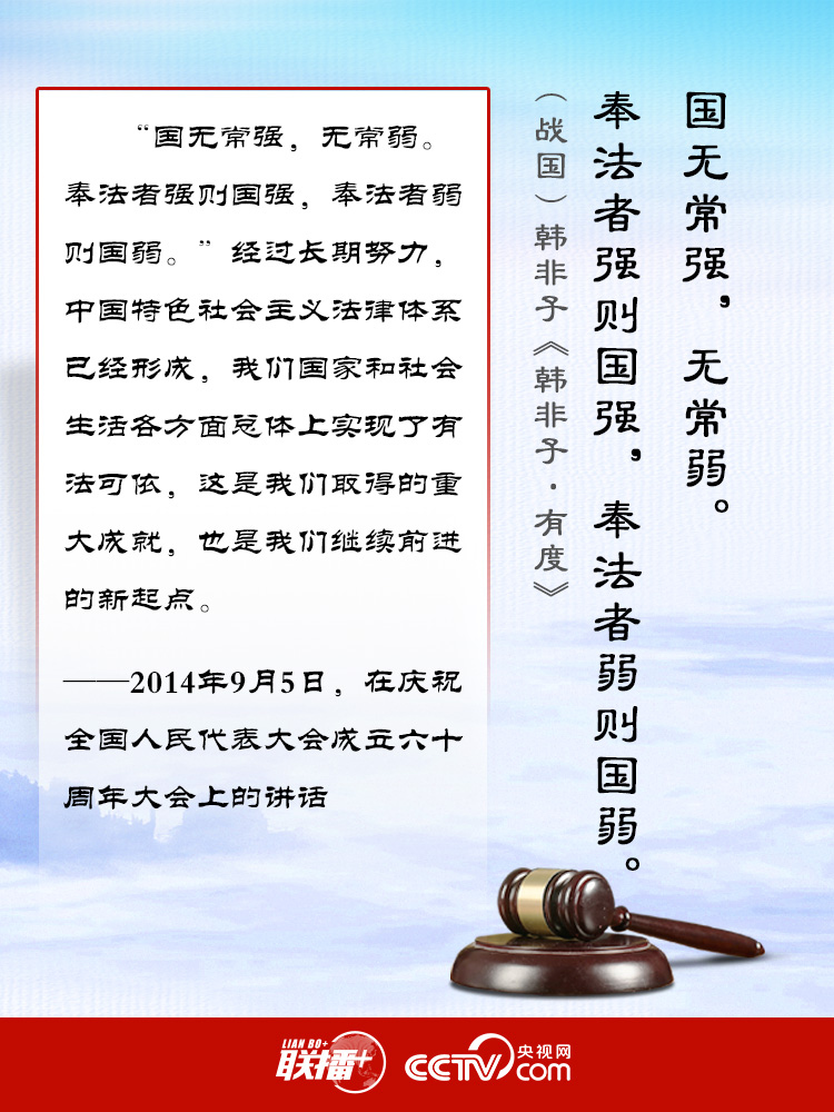 五年前,黨的十八屆四中全會在京閉幕,明確提出全面推進依法治國的總目標、重大任務。近年來,習近平總書記對法治的重視和推進一以貫之,多次引用經典名句,旁徵博引地闡釋全面依法治國的要義。央視網《聯播 +》特精選部分話語,與讀者共勉。