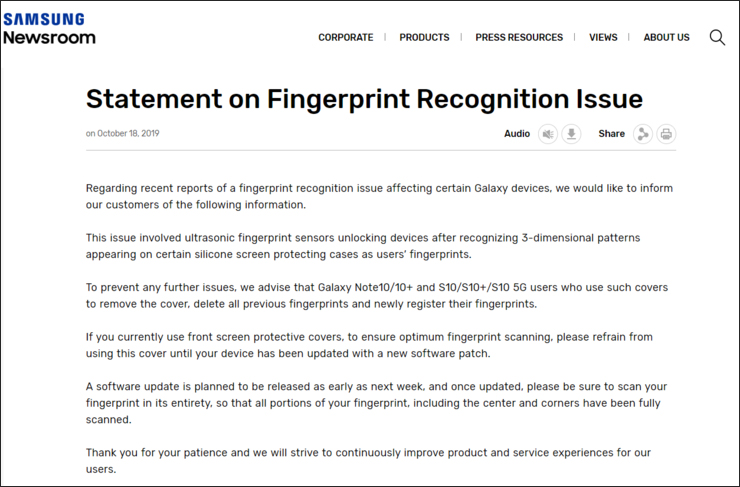10月18日,三星官方對指紋安全漏洞進行了回應,三星承認了這一安全漏洞,並且建議 Galaxy Note10 / 10 + 和 S10 / S10 + / S10 5G 這些型號的手機不要使用硅膠的手機保護設備,刪除所有以前的指紋,並重新註冊指紋。三星方面表示,最早將會在下週推送修復補丁,完全修復這個漏洞。