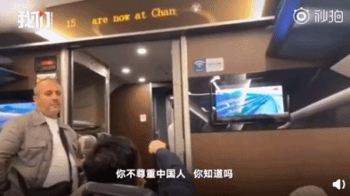 視頻內容顯示一位坐在座位上的乘客,手指前方站在車廂連接處的白衣男子,憤慨發聲“你不尊重中國人,你知道嗎!”對方也隨即反問“我怎麼不尊重中國人?”