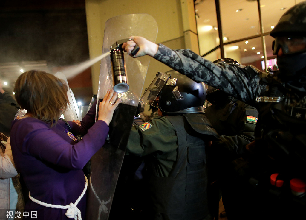 10月21日,玻利維亞拉巴斯,一名防暴警察向示威者噴胡椒水。圖自視覺中國