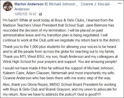 安德森本人也在自己的社交賬號上發帖確認了此事,在感謝大眾支持的同時,他也期待着這項害慘他的政策能夠改善,整體教學環境有所變革。