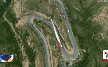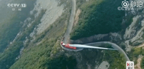 由於風力發電機大多建在山頂上,可想而知,這些發電機的葉片就得從山底搬上去。如此,圖片中的這一幕發生了。