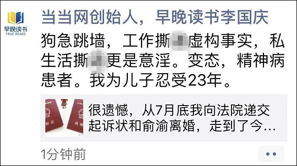 據第一財經報道,除了微博內容,李國慶在個人微信朋友圈轉發自己的微博內容還留言道:“狗急跳牆,工作撕X虛構事實,私生活撕X更是意淫。變態,精神病患者。我為兒子忍受23年。”