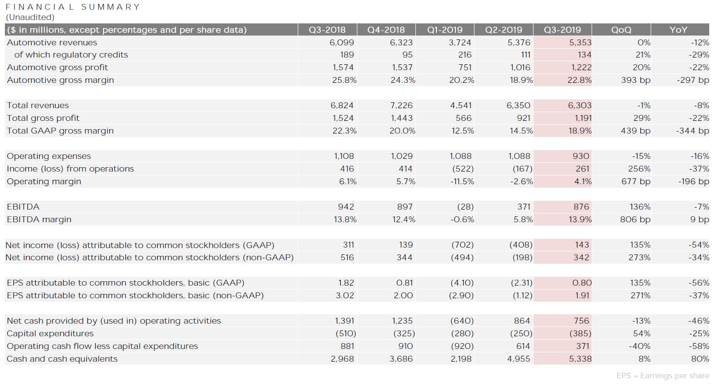 2019年第三季度,特斯拉的營業收入為63.03億美元,同比下降8%;淨利潤1.43億美元,是公司上市以來盈利的第5個季度,同比下降54%,但經調整每股盈利1.86美元,遠超此前華爾街分析師預期的每股虧損0.24美元。