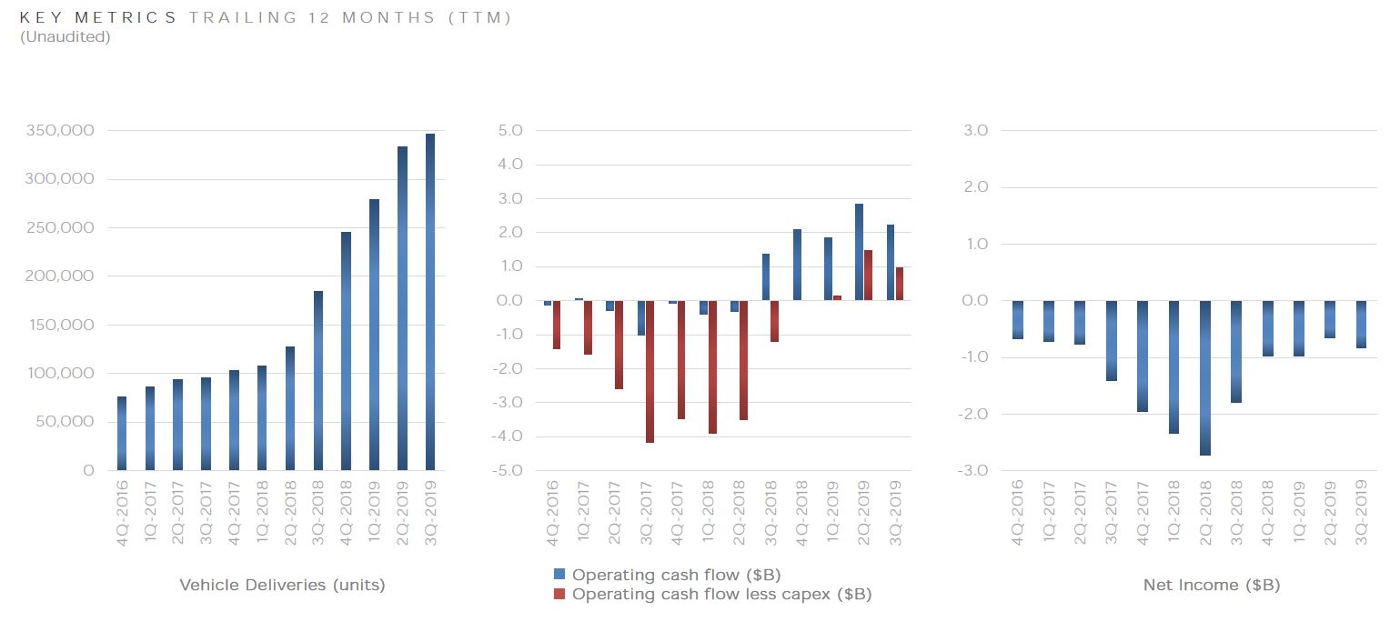 2016 Q4-2019 Q3,特斯拉歷季的銷量、營運現金流和淨收入