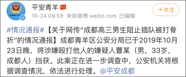 高三男生阻止插隊被打骨折,成都警方通報