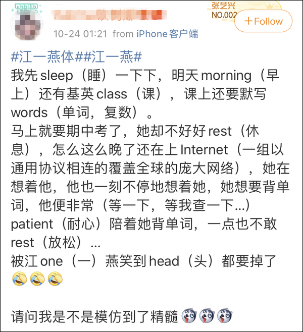 不過,更多人是從中感受到了樂趣,開始爭相模仿起“江一燕體”來。