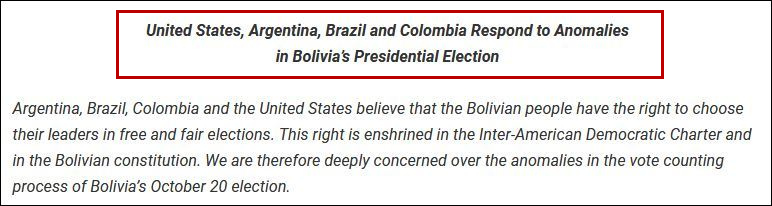 在24日的OAS常務理事會特別會議上,美國拉着阿根廷、巴西、哥倫比亞四國發表聯合聲明,呼籲玻利維亞與OAS合作,以確保“透明”和“可信”的計票,並舉行第二輪總統選舉。