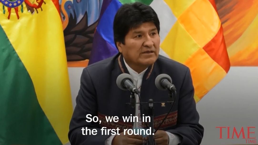 24日,莫拉萊斯在演講時宣佈自己“獲勝”,他稱,“我們在第一輪就贏了,還有1.58%的選票需要清點,但我們贏得了農村地區的選票。”