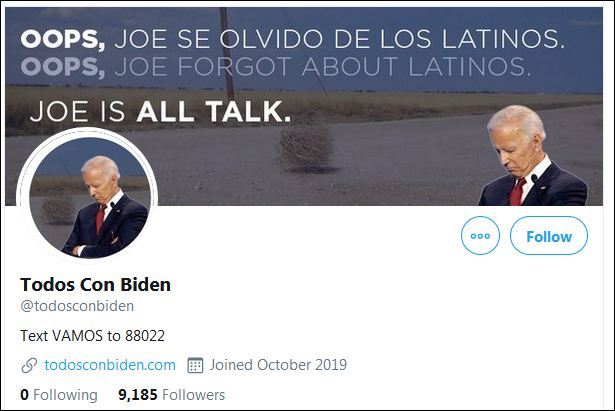 對拜登團隊來説,更糟糕的是,該計劃@Todos Con Biden的推特賬號也到了特朗普團隊的手裏。該賬號發的幾篇帖子對拜登在競選過程中所犯的錯誤進行了嘲諷,還有一些帖子則是批評他過去在邊境安全問題上的言論。