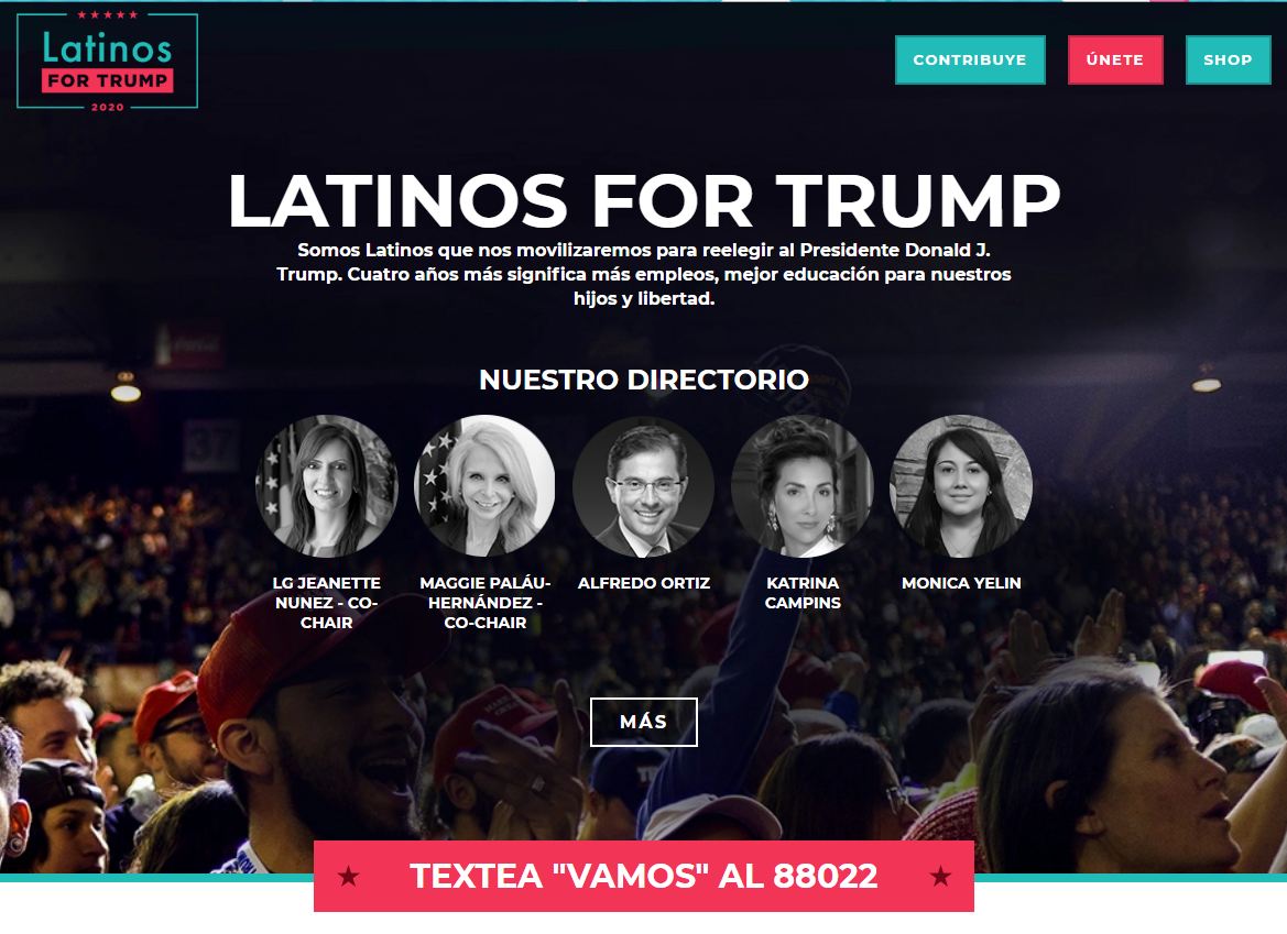 網站左邊有兩個醒目的鏈接,一個鏈接到“特朗普的拉美裔支持者”網站,另一個則轉到特朗普的2020競選網站,上面人們可以買到特朗普的周邊產品。