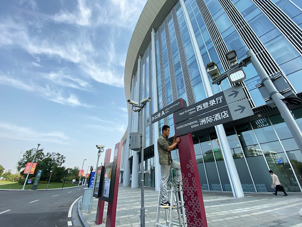 進博會新聞中心門外,一位工作人員正在進行導向標識安裝工作。澎湃新聞記者 俞凱 圖