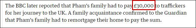 在BBC的採訪中,Pham的哥哥Pham Ngoc Tuan表示,妹妹從越南偷渡到英國的花費為3萬英鎊,有一部分已經給了人販子,而他們所知道的Pham最後所在地點是比利時。一位Pham家的熟人向《衞報》證實,為了支付這筆錢,她們家不得不將房子抵押出去。
