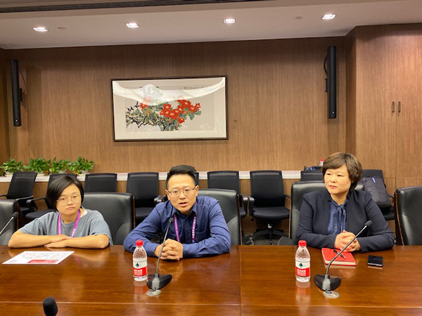 第二屆進博會裝備展區負責人田野(中)向媒體介紹裝備展區情況。