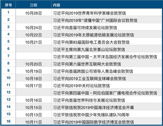 十月以來,在國內和國際舞台上,多場重要的會議、論壇、活動先後召開和舉行,向世界傳遞着前沿、主流的聲音。對於這些活動,習近平主席也給予了高度關注,根據《新聞聯播》刊播的消息統計,從10月11日到26日16天的時間裏,習近平共發出了16封賀信,最多的一天連發3封賀信。