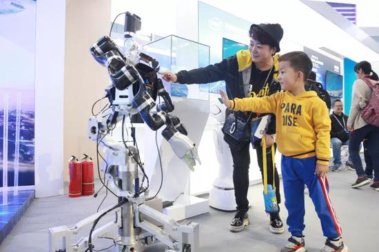 △2019中關村論壇上,人工智能、5G、工業互聯網、腦科學技術等熱門議題被人們頻頻討論。一批重大創新成果面向全球發佈,展示着來自全球最新最前沿的科技成果。圖為“中關村國際前沿科技成果展”現場,參觀者與服務型機器人互動。