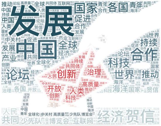 通過對這16封賀信的文本進行分析,我們發現,發展、中國、合作、經濟、科技、創新成為了習近平提到的高頻詞。