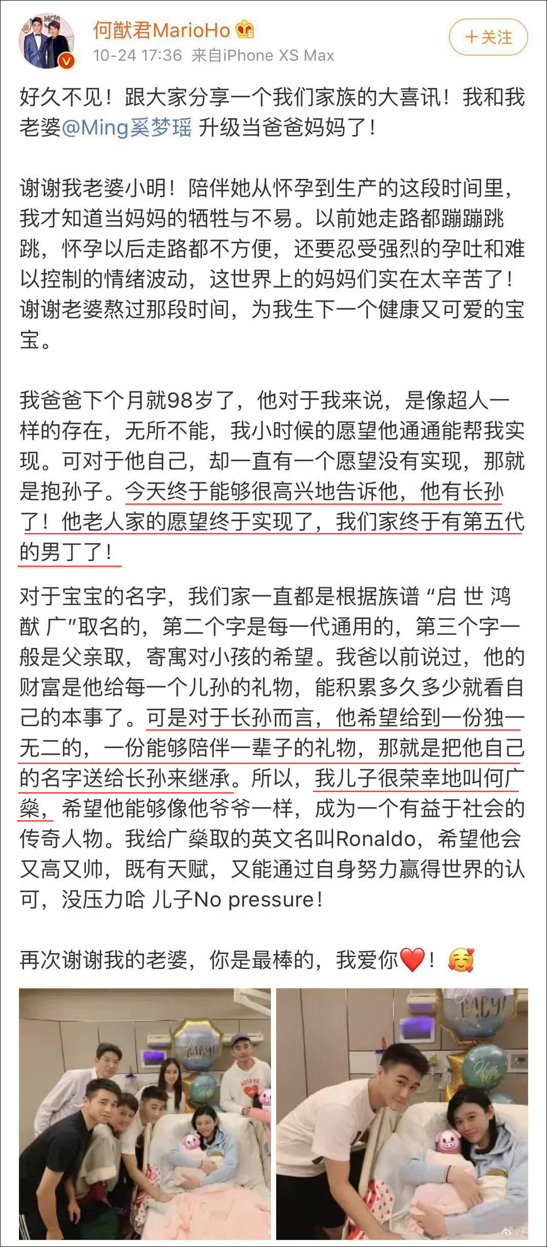 該帖子中,何猷君公佈喜訊後,宣佈了兒子的名字叫何廣燊,他大篇幅介紹,兒子作為終於出世的何家第五代男丁,父親何鴻燊將自己的名字送給了長孫來繼承,認為兒子很榮幸。