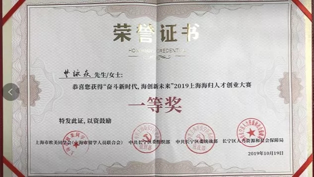 楚航科技CEO楚詠焱獲頒“2019上海海歸人才創業大賽"一等獎。被訪者供圖,下同