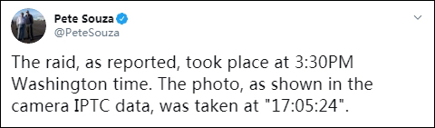 他説,“突襲據報道發生在華盛頓時間26日下午3:30,可照片中的IPTC數據證明是拍攝於華盛頓時間下午5:05:24”,即“行動開始”近2個小時後。