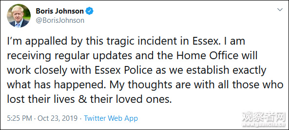 早在當地時間23日,也就是39具遺體被發現後不久,約翰遜就表示了對該事件的震驚,並呼籲警方儘快調查,捉拿兇手,“我時刻接受(該事件的)更新信息,內政部將與埃塞克斯警方密切合作,以確定到底發生了什麼。我與喪生者和他們的親人同在。”