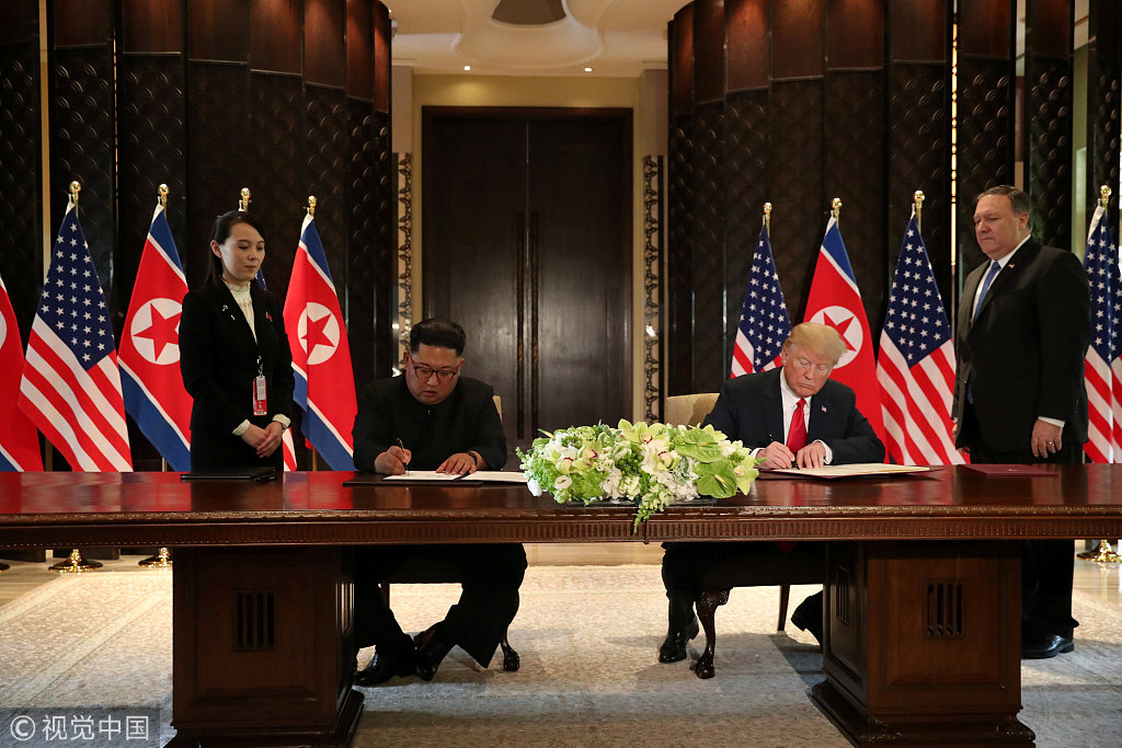6月12日,朝鮮最高領導人金正恩(左)與美國總統特朗普在新加坡舉行會晤 @視覺中國