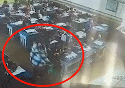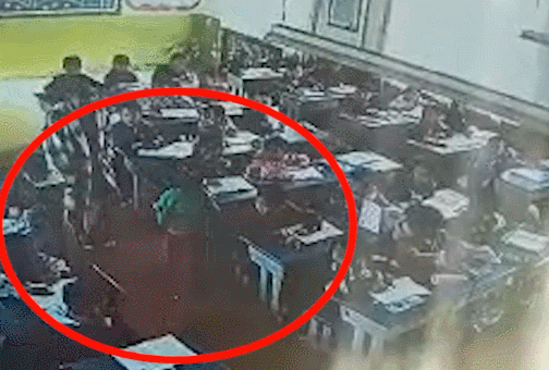 視頻顯示,這名女老師對女孩兒施暴長達2分多鐘。女老師不斷錘擊女孩兒頭部,並用手撕扯其耳朵,隨後將女孩兒拉到過道一腳踹向講台。