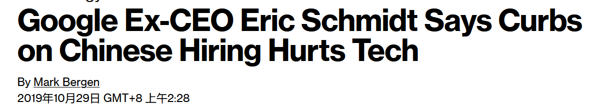 10月29日,彭博社報道稱,谷歌前首席執行官、五角大樓現任首席技術顧問施密特(Eric Schmidt)認為,美國限制從中國聘請人才以及限制與中國共享科技會適得其反。