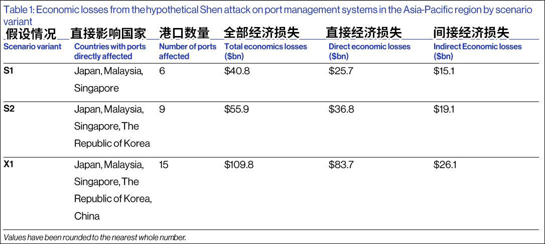 在第一種情況中,日本、馬來西亞與新加坡的6個港口因此癱瘓,帶來的直接間接經濟損失達408億美元,第二種情況加入韓國的3個港口,經濟損失總額達到559億美元。