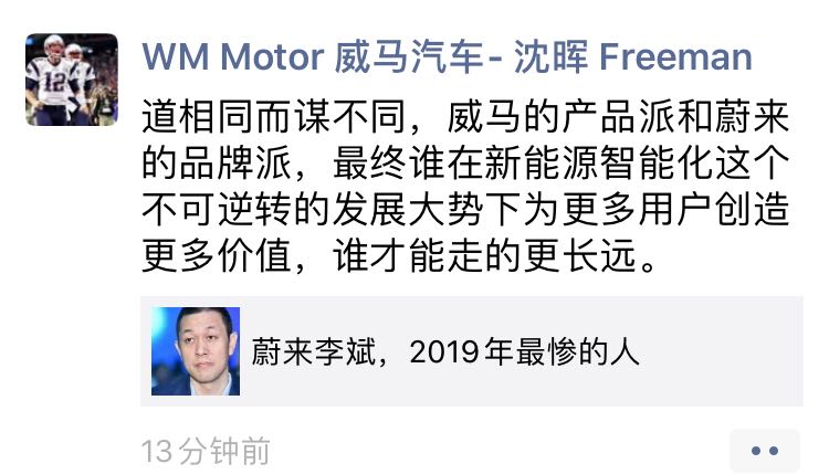 但相比李斌、何小鵬的惺惺相惜,威馬汽車創始人沈暉的態度就不那麼友好了。對於《蔚來李斌,2019年最慘的人》一文,沈暉同樣在朋友圈發表了評論。他將蔚來稱為“品牌派”,而威馬則是“產品派”,暗指蔚來只重視品牌宣傳,而威馬才更重視產品。