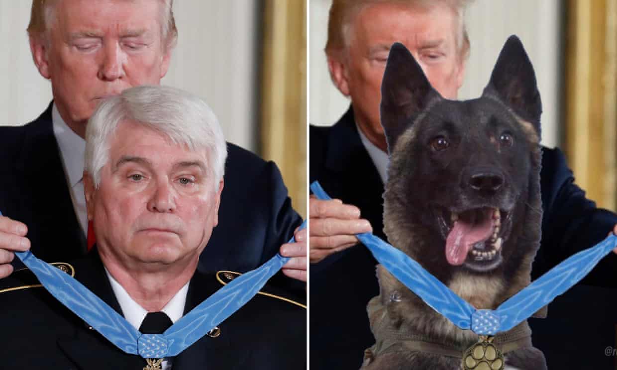 但在此之前,他在自己的社交媒體上曬出經過Photoshop軟件處理過的照片,將一枚特質的榮譽勳章,頒發給幾天前在“獵殺IS頭目巴格達迪”任務中唯一受傷的美軍成員:一隻狗。