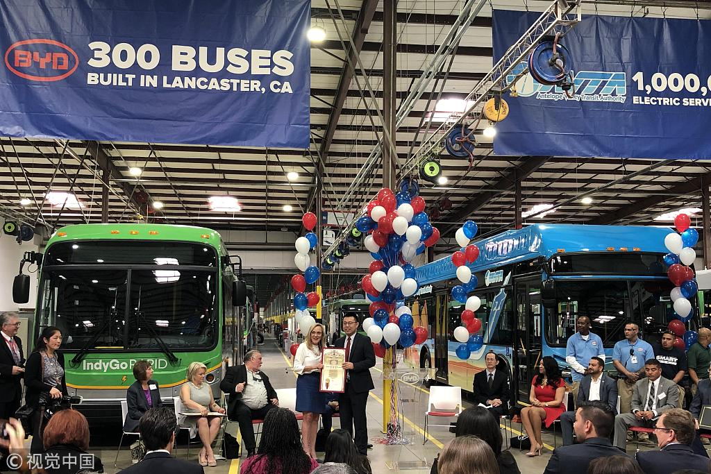 比亞迪慶祝在美生產的第300輛電動大巴正式下線 圖自視覺中國