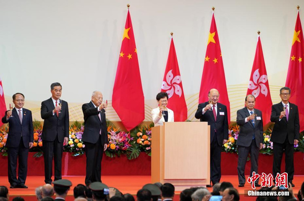 2019年7月1日上午,香港特別行政區政府在香港會展中心舉行酒會,慶祝香港特區成立22週年。全國政協副主席董建華(左三)和梁振英(左二)、香港特區行政長官林鄭月娥(中)、中央政府駐港聯絡辦主任王志民(左一)等嘉賓出席酒會。中新社記者 張煒 攝