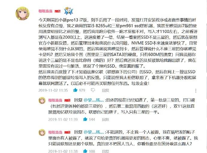 IT之家11月3日消息 近日有用户反饋稱,聯想小新Pro 13的部分批次固態硬盤從三星PM981A換成億聯了,因此還出現了退貨現象。