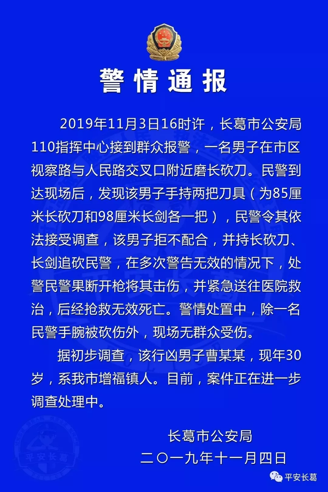 今天上午,長葛市公安局官方微信發佈警情通報,行兇男子曹某某,經搶救無效死亡。