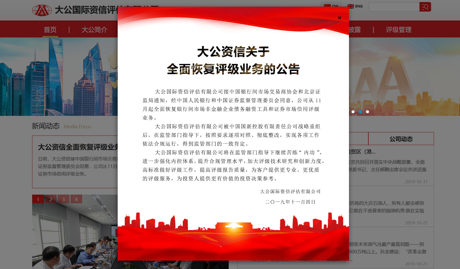 中國銀行間市場交易商協會和北京證監局通知大公國際資信評估有限公司(簡稱“大公資信”),經中國人民銀行和中國證券監督管理委員會同意,於11月起全面恢復大公資信銀行間市場非金融企業債務融資工具和證券市場信用評級業務。