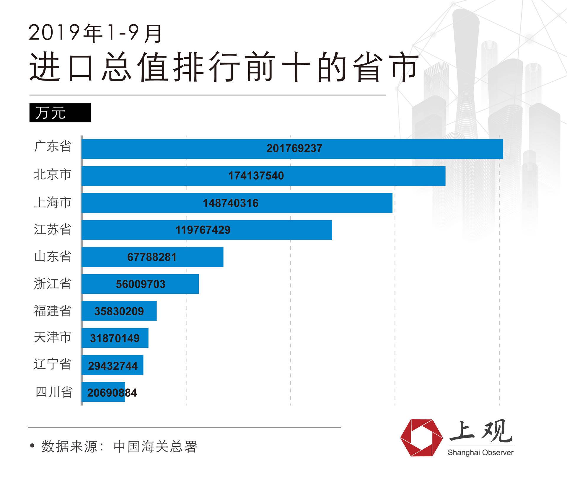 中國進口商品主要的供貨地區為東部。2019年前9個月,以東部地區為收貨地的進口額佔全國的84.5%。進口額排名前10的省市中排名第一的是廣東省。
