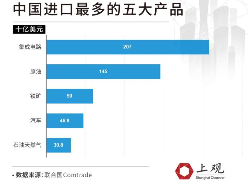 不過,中國進口貨物中金額最大的還是集成電路。根據聯合國貿易數據,中國在2017年共進口價值2070億美元的集成電路商品,佔當年總進口額的13%。而根據海關總署統計,2018年中國集成電路產品進口額為20584.1億元人民幣(約3120.6億美元)。2019年儘管同比有所下降,但1-8月的進口額仍達到1921.24億美元。