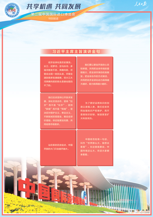 ——各界人士熱議習近平主席在第二屆中國國際進口博覽會開幕式上的主旨演講 第二屆中國國際進口博覽會5日在上海國家會展中心開幕。國家主席習近平出席開幕式並發表題為《開放合作 命運與共》的主旨演講。“共同把經濟全球化動力搞得越大越好、阻力搞得越小越好”“堅持‘拉手’而不是‘鬆手’,堅持‘拆牆’而不是‘築牆’”“中國市場這麼大,歡迎大家都來看看”……習近平主席的主旨演講鏗鏘有力,一個個金句打動人心,引發各界人士熱議。