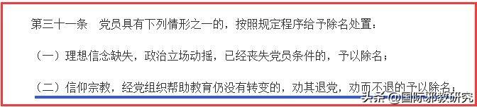 ▲《中國共產黨黨員教育管理工作條例》第三十一條規定:黨員具有下列情形之一的,按照規定程序給予除名處置:(二)信仰宗教,經黨組織幫助教育仍沒有轉變的,勸其退黨,勸而不退的予以除名。