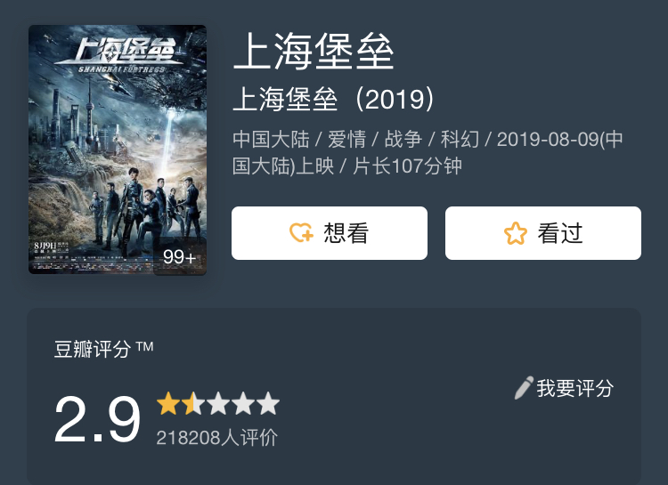 “《流浪地球》之後,人們對於科幻電影的期待,可能十分地高。《上海堡壘》首先至少是一個很正常的科幻片,怎麼它也不可能在豆瓣上才三點幾分,它沒有網絡上説得那樣不堪,網絡的負反饋,分越低越往低了打,不太正常的一種導向,我覺得它可能是一種受害者。”